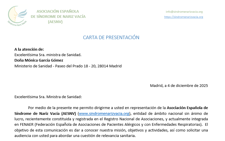 Desde la Asociación Española de Síndrome de Nariz Vacía (AESNV) seguimos avanzando en nuestro compromiso de trabajar por el reconocimiento, la mejora del diagnóstico y la atención adecuada de las personas afectadas por el Síndrome de Nariz Vacía (SNV).