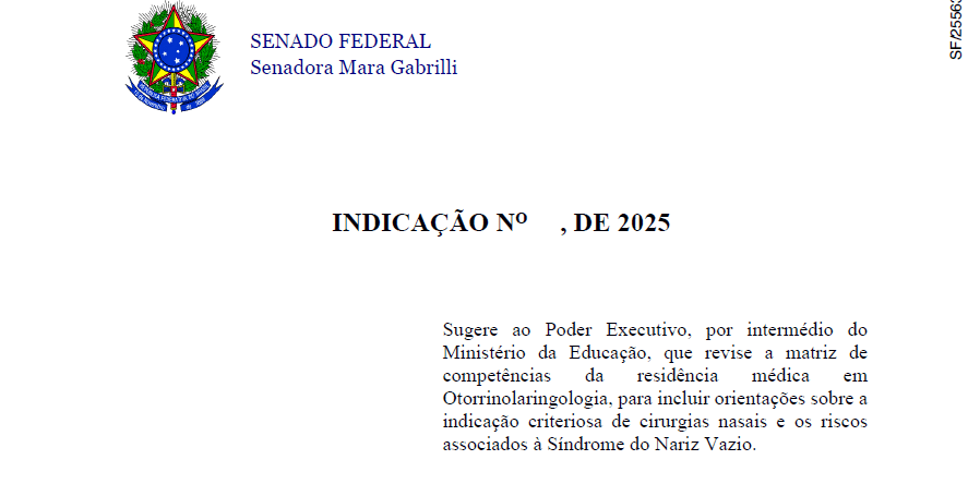El Senado Federal de Brasil ha dado un paso relevante en el reconocimiento institucional del Síndrome de Nariz Vacía (SNV) al presentar la Indicación nº 84/2025, impulsada por la senadora Mara Gabrilli, en la que se solicita al Ministerio de Educación la revisión de la formación médica especializada en Otorrinolaringología.